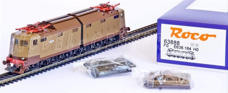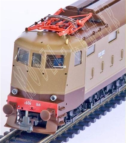 Locomotiva elettrica E636.164, livrea castano/isabella deposito Loc. Milano SM.to costruttore OFFICINA SAVIGLIANO, pantografi tipo 52, trazione sui 4 assi, 2 ruote gommate e volano sull'asse motore - FS, epoca IV/V, lunghezza 21,00 cm, cambio luci bianche e rosse, presa per decoder a 8 poli, pantografi funzionanti, gancio Nem, scala HO.