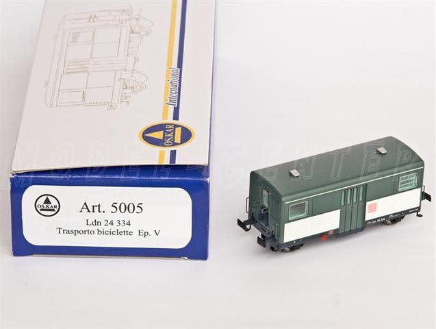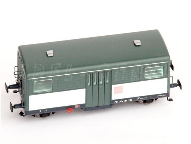 Bagagliaio Ldn 24.334, livrea verde/grigio/bianco, con logo biciclette rosa FS. Tale riproduzione, rispecchia l'esemplare unico così come allestito dal deposito di Udine negli anni 80/90 per il trasporto biciclette al seguito nei treni appositamente allestiti in orario. Il nostro Ldn 24 rappresenta una versione con pareti laterali ondulate (non risanate) ed è ambientabile nell'epoca V.