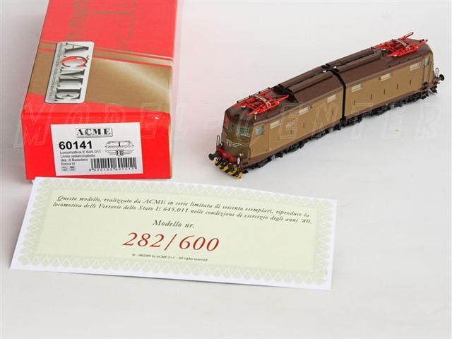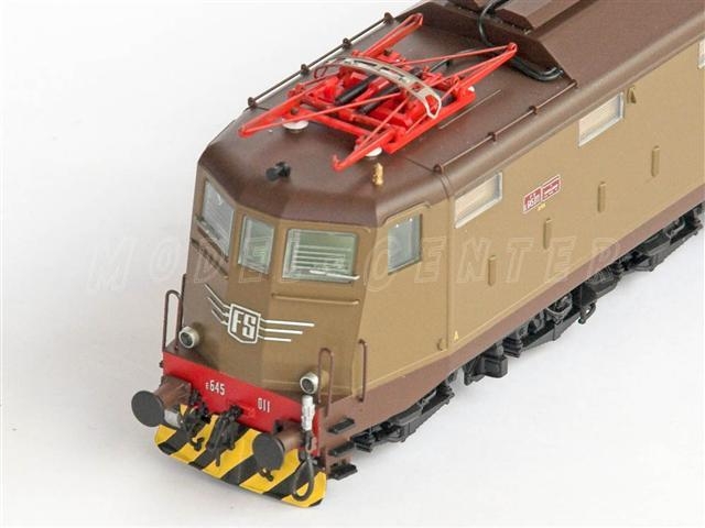 Riproduzione in perfetta scala 1:87 della locomotiva delle FS E645.011 di pirma serie, deposito di Bussoleno, nella livrea castano e isabella, portelli A.T. bassi, fregio frontale alato. - Epoca V EDIZIONE LIMITATA E NUMERATA A 600 PZ Lunghezza 21,00 cm - Cambio luci bianche e rosse - Presa per decoder a 8 poli - nuovi pantografi ACME fs52/92 con riproduzione del sistema di sollevamento - Pantografi funzionanti - Gancio Nem - Scala HO.
