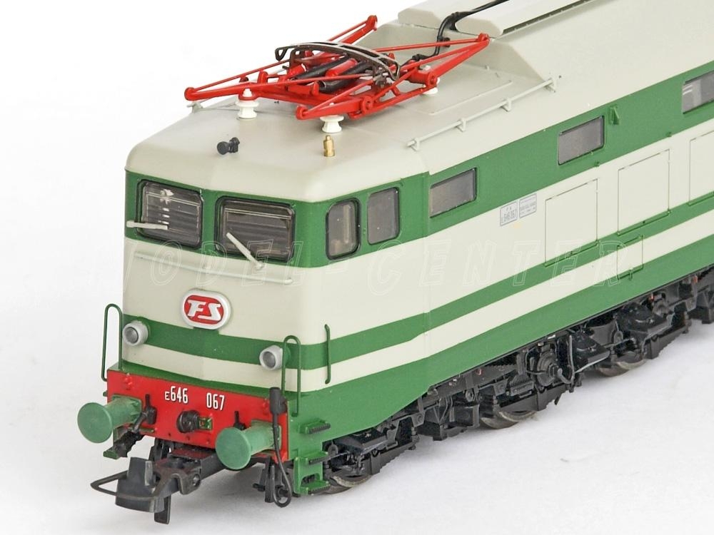 Locomotiva elettrica E 646.07 livrea grigio perla/verde magnolia, Dep.Loc di Bologna costruttore BREDA, logo FS in rilievo con fondo rosso, trazione sui 4 assi, 2 ruote gommate e volano sull'asse motore - FS, epoca V, lunghezza 21,00 cm, cambio luci bianche e rosse a seconda del senso di marcia, presa NEM per decoder a 8 poli, pantografi funzionanti, gancio Nem, scala HO.