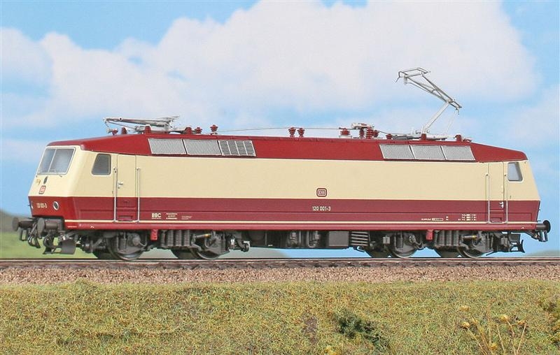 Locomotiva elettrica Br.120 001-3 nella livrea d'origine della DB, con una linea AT sul tetto e pantografi d'origine. Cassa in metallo, timoni di allontanamento a norme NEM, motore Canon, respingenti molleggiati, cambio luci bianche/rosse in base al senso, decoder 21 poli Lok sound ESU (digital sound) con terzo faro e luci in cabina accendibili separatamente con tasti funzione. Epoca IV - Lunghezza < 22,1 cm > - Scala HO.