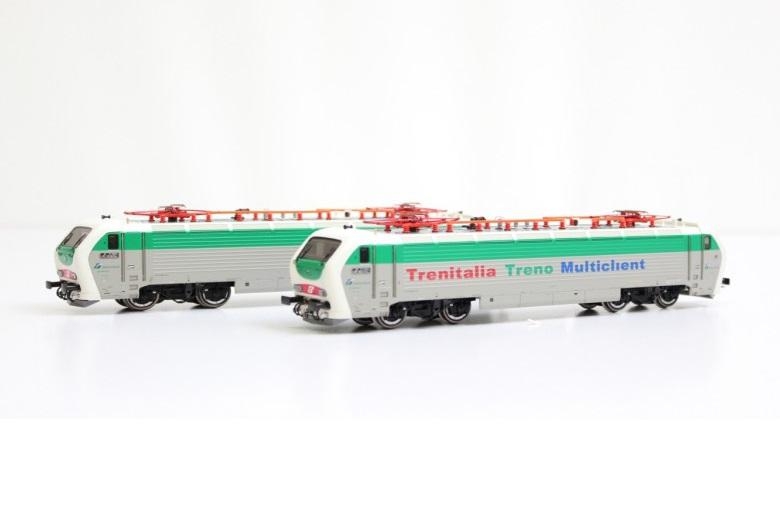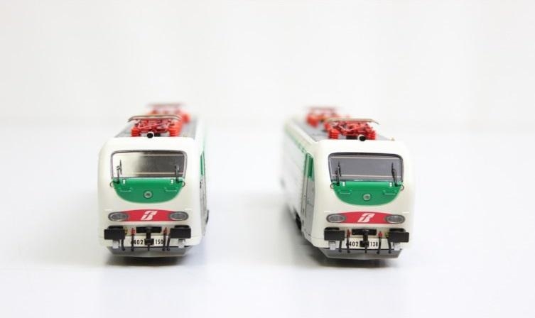 Set di due locomotive elettriche E 402B 150 + E 402B 138 Multicliente entrambe motorizzate e in livrea d'origine delle FS. Telaio in metallo, cambio luci bianche/rosse (con terzo faro) a seconda del senso di marcia, motorizzazione a doppio cardano a 5 poli, pantografi funzionanti, presa per decoder digitale a 21 poli, respingenti molleggianti. Epoca V - Lunghezza < 22,30 X 2 cm > Scala HO.