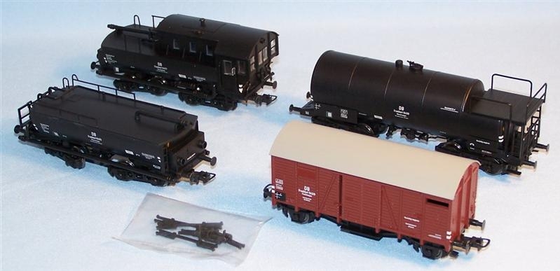 Set convoglio 4 carrozze merci DB. Il set consiste in un vagone merci, un carro cisterna, un vagone mixer e un vagone spray. Epoca III - Lunghezza 46 cm. Scala HO.