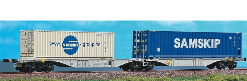 Carro intermodale tipo Sggmrss '90 bimodulo "HectorRail" con carico di casse mobili. Epoca V/VI - Lunghezza 34 cm. Scala HO.