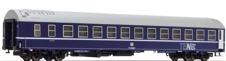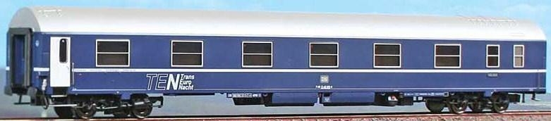 Carrozza letti di tipo MU 1967 delle DB nella livrea TEN, respingenti molleggiati, predisposizione per l'illuminazione interna, rifinitissimi particolari interni, sistema Nem, Ep. IV, lunghezza < 30,3 cm >.