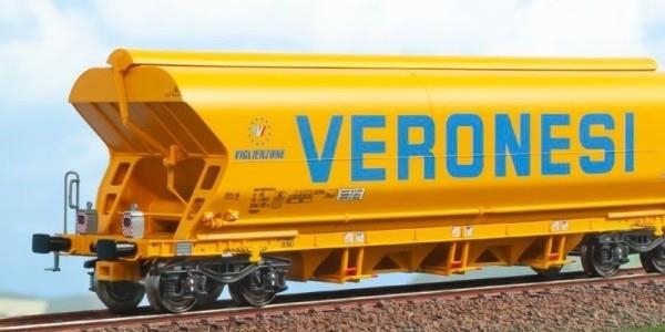 Carro tramoggia per trasporto cereali di Tipo Tagnpps della società 'Veronesi' nuova numerazione e fanali di coda a led di tipo FS con sistema DCC/DC , rifinitissimo, produzione NME in esclusiva per BLACKSTAR, Sistema Nem, Lunghezza <18,5> Cm. , Ep. VI, Scala H0