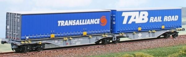 Carro intermodale Tipo Sggmrss della società ERMEWA da 90 piedi caricato con due casse mobili, una TAB Rail Road, e una TRANCEALLIANCE, Sistema Nem, Lunghezza <34,0> Cm. , Ep. V/VI, Scala H0.