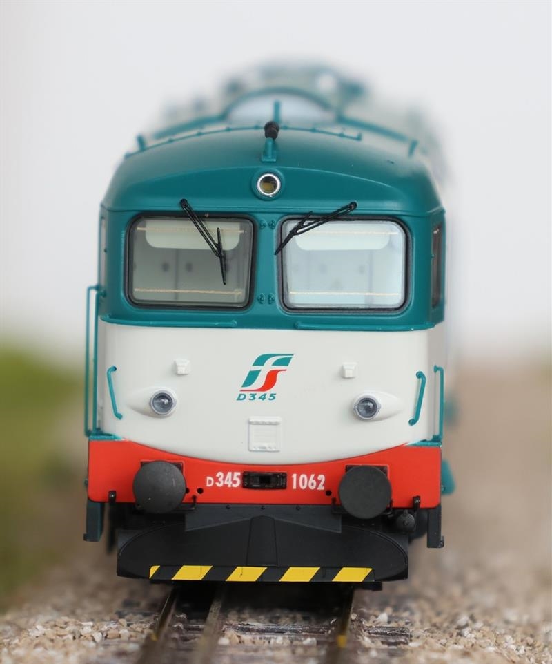 FS D 345.1062 vetri piani livrea XMPR2 con SSC Dep. Palermo, con vomere. Potente motore a 5 poli, telaio in metallo, cassa in ABS, Arredo cabine riprodotto. Nuovo impianto elettrico con presa per decoder Plux22, speaker installato di serie, ventole sul tetto realmente funzionanti, illuminazione (interna della cabina. fanali anteriori e posteriori, terzo faro) funzionante. Tutte le funzioni luci comandabili in analogico tramite micro interruttori e in digitale con funzioni decoder. Timone di allontanamento con porta gancio a norma NEM su entrambe le testate. Frontali configurabili con pancone modellistico/vomere chiuso/vomere aperto e porta gancio, Ep. VI , Lunghezza <15,4 >Cm. , Scala H0.