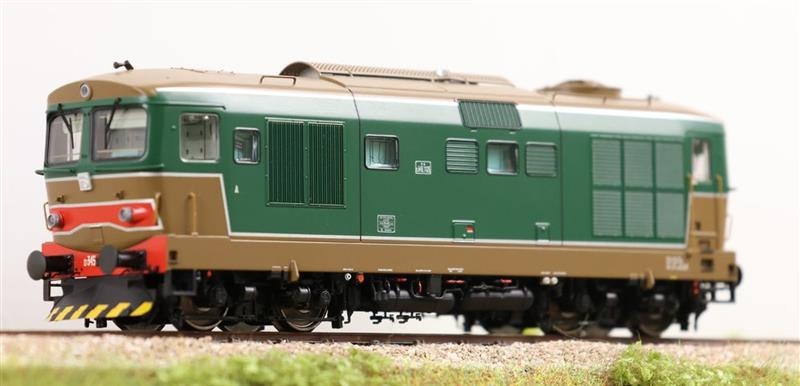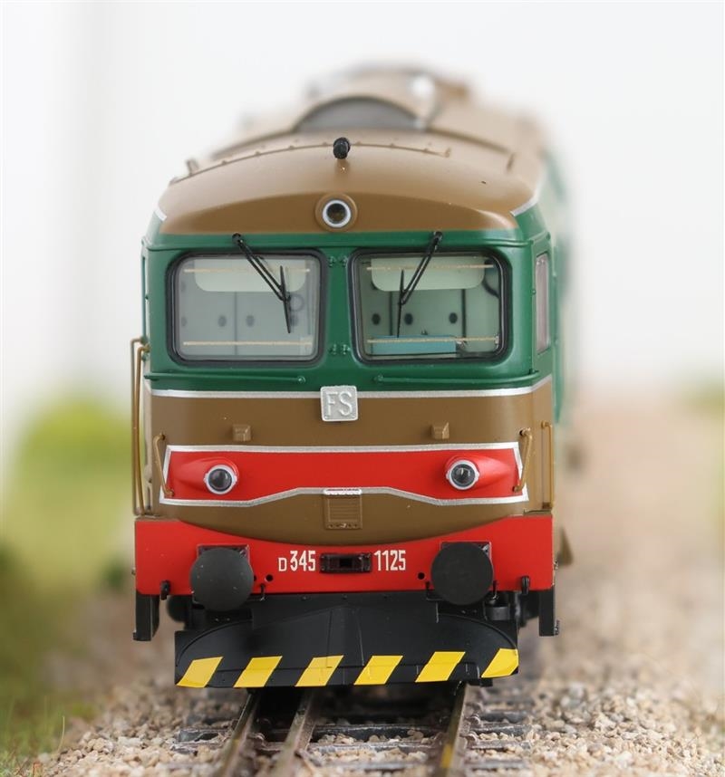 FS D 345.1125 vetri piani livrea d'origine, Dep. Alessandria, con vomere, Potente motore a 5 poli, telaio in metallo, cassa in ABS, Arredo cabine riprodotto. Nuovo impianto elettrico con presa per decoder Plux22, speaker installato di serie, ventole sul tetto realmente funzionanti, illuminazione (interna della cabina. fanali anteriori e posteriori, terzo faro) funzionante. Tutte le funzioni luci comandabili in analogico tramite micro interruttori e in digitale con funzioni decoder. Timone di allontanamento con porta gancio a norma NEM su entrambe le testate. Frontali configurabili con pancone modellistico/vomere chiuso/vomere aperto e porta gancio, Ep. VI , Lunghezza <15,4 >Cm. , Scala H0.