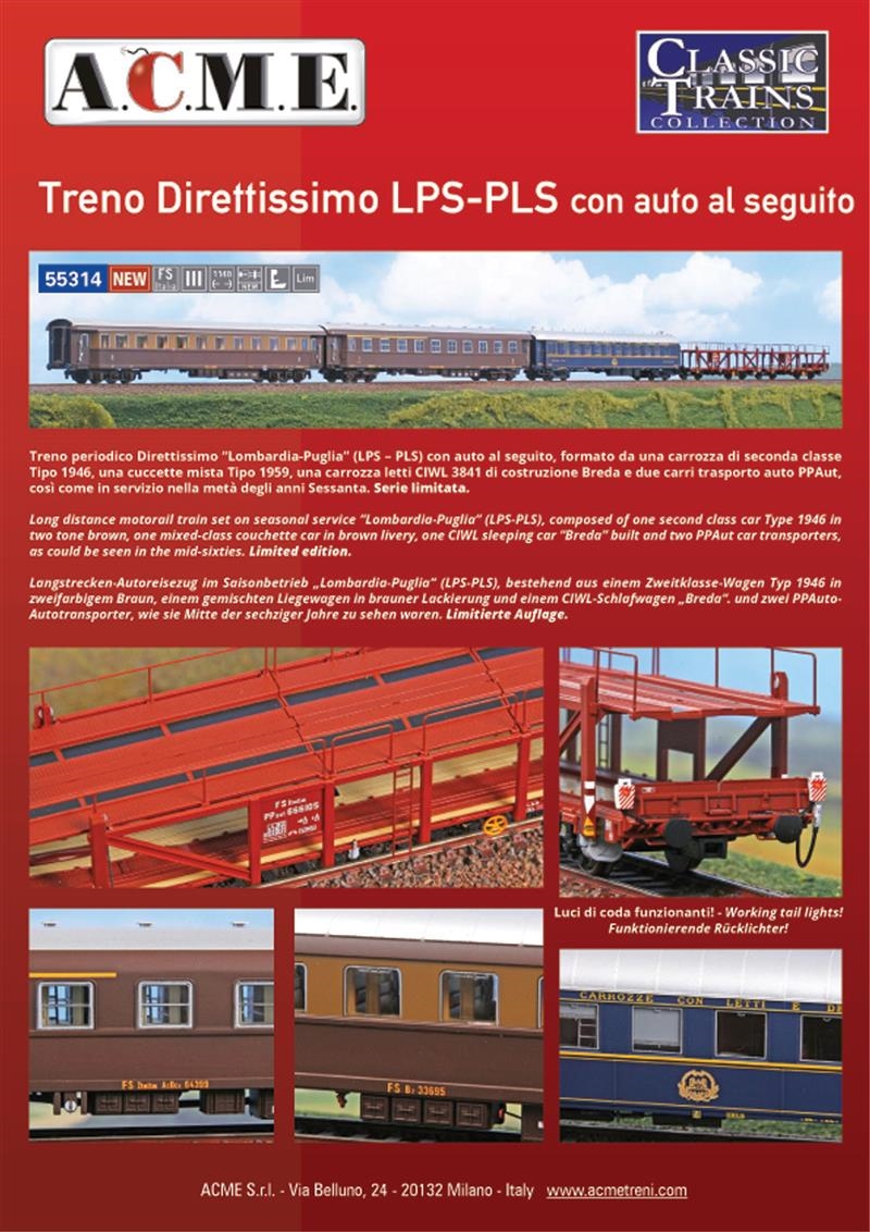 FS Set TRENO DIRETTISSIMO "Lombardia-Puglia-Lombardia (LPS-PLS) con carri trasporto auto, formato da una carrozza di seconda classe Tipo 1946, una carrozza a cuccette mista Tipo 1959, una carrozza letti CIWL 3841 di costruzione Breda e due carri trasporto auto PPAut di cui uno dotato di fanali di coda di Tipo FS funzionanti in AC e DC, entrambi i carri hanno i ponti superiori mobili, il set è proposto così come in servizio nella metà degli anni sessanta, SERIE LIMITATA, magnifica riproduzione, arredi dettagliati e particolarmente rifiniti, predisposizione per l'illuminazione interna, Sistema Nem, Ep. III Lunghezza <1,148> Cm. , Scala H0.